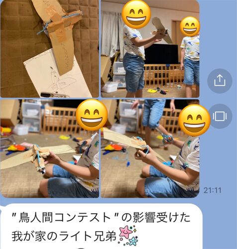 妻からLINEが来ていた。 どうやら、双子は、 鳥人間コンテストのテレビを見て、 刺激を受け、 ダンボールで飛行機を作成しているようだ! 双子は、工作好きだから、 未来のライト兄弟かもね✨ 実は、 LINEには続きがあった! 早く寝ろーってね。 妻は、 子供…
